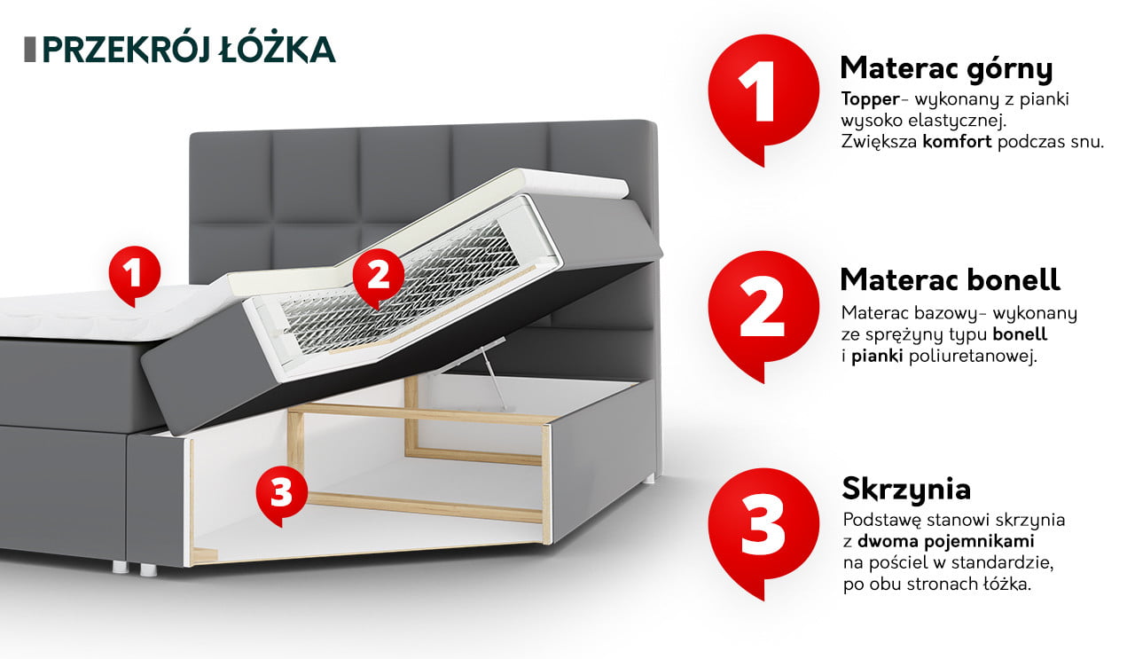 Łóżko sypialniane z dwoma pojemnikami to wyjątkowy mebel, który wprowadza do sypialni komfort i elegancję. Jego przestronna powierzchnia zapewnia idealne warunki do wypoczynku, a starannie zaprojektowane detale sprawiają, że sen staje się prawdziwą przyjemnością. Łóżko AMORE zostało wyposażone w dwa niezależne pojemniki, które oferują dodatkowe miejsce do przechowywania pościeli, koców czy poduszek. To wygodne rozwiązanie, które ułatwia organizację i pomaga utrzymać porządek w sypialni.