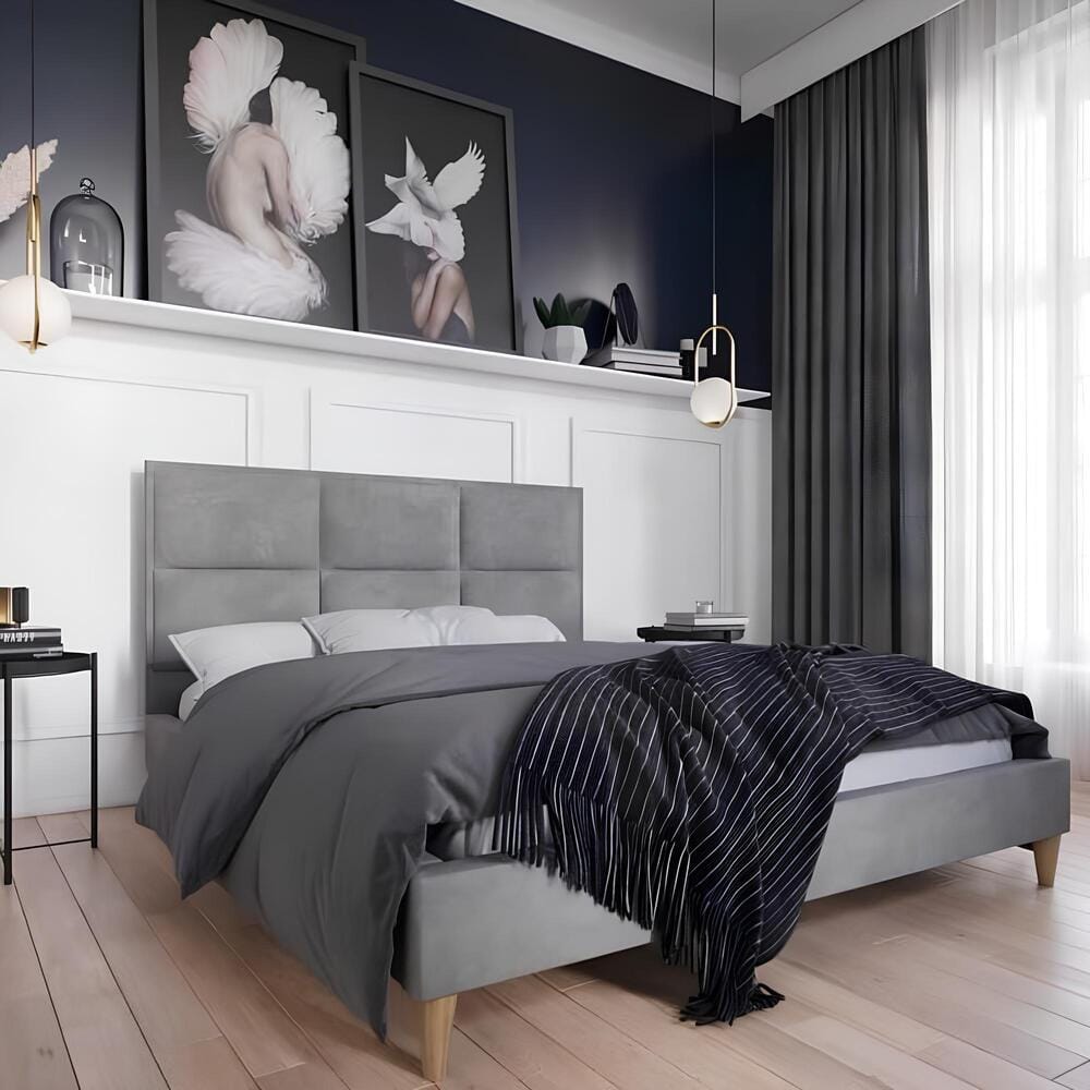 Łóżko BLUM to stylowy wybór dla każdego, kto ceni sobie elegancję i funkcjonalność. Dzięki tapicerowanemu wykończeniu oraz wysokim nóżkom, model ten stanowi wyjątkowy element każdej nowoczesnej sypialni. To łóżko przyciąga wzrok swoim designem i gwarantuje wygodę na najwyższym poziomie. Łóżko BLUM opiera się na solidnej konstrukcji, która zapewnia stabilność i wytrzymałość na lata. Wysokie, drewniane nóżki nadają mu lekkości, wprowadzając do wnętrza subtelną elegancję. Duże, tapicerowane wezgłowie stanowi centralny punkt łóżka i przyciąga uwagę oryginalnym wzorem, wnosząc wyjątkowy styl i komfort do Twojej sypialni.