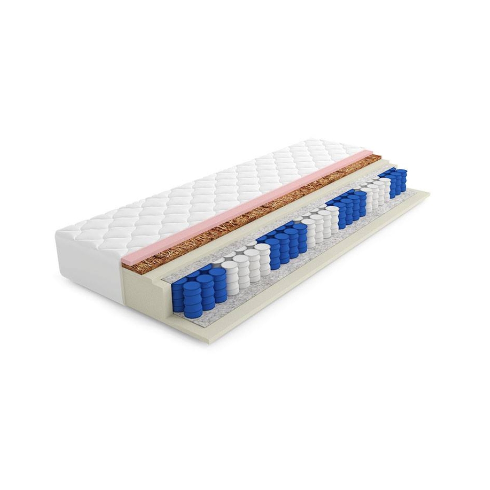 Na powierzchni znajduje się 3-centymetrowa warstwa pianki termoelastycznej VISCO, która reaguje na ciepło ciała i precyzyjnie dopasowuje się do jego kształtu. Dzięki temu materac redukuje punktowy nacisk i wspiera prawidłowe ułożenie kręgosłupa podczas snu. Dodatkowo wkład kokosowy (1200 g/m², grubość ok. 1,2 cm) zapewnia dodatkową sztywność i wentylację, co zwiększa komfort i trwałość konstrukcji.