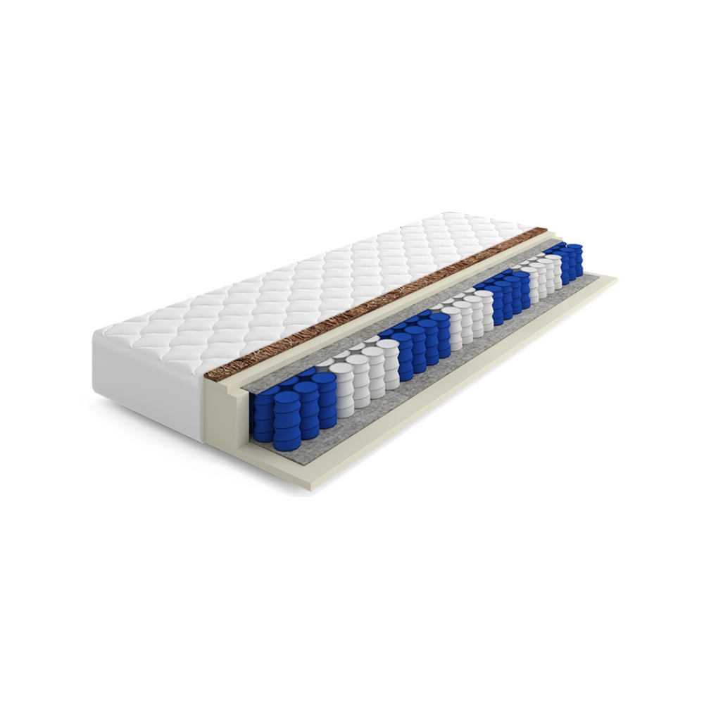 Na powierzchni materaca znajduje się warstwa wkładu kokosowego (1200 g/m², grubość około 1,2 cm), która zwiększa sztywność i stabilność konstrukcji, a jednocześnie poprawia przewiewność. Dodatkowo, pianka poliuretanowa (2 cm) zapewnia elastyczność i komfort, a przekładki tapicerskie (filc) wzmacniają całą strukturę materaca.
