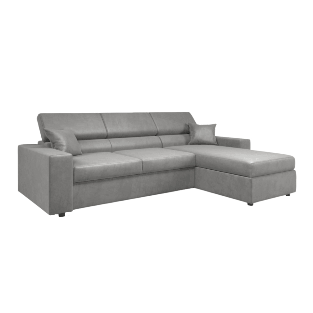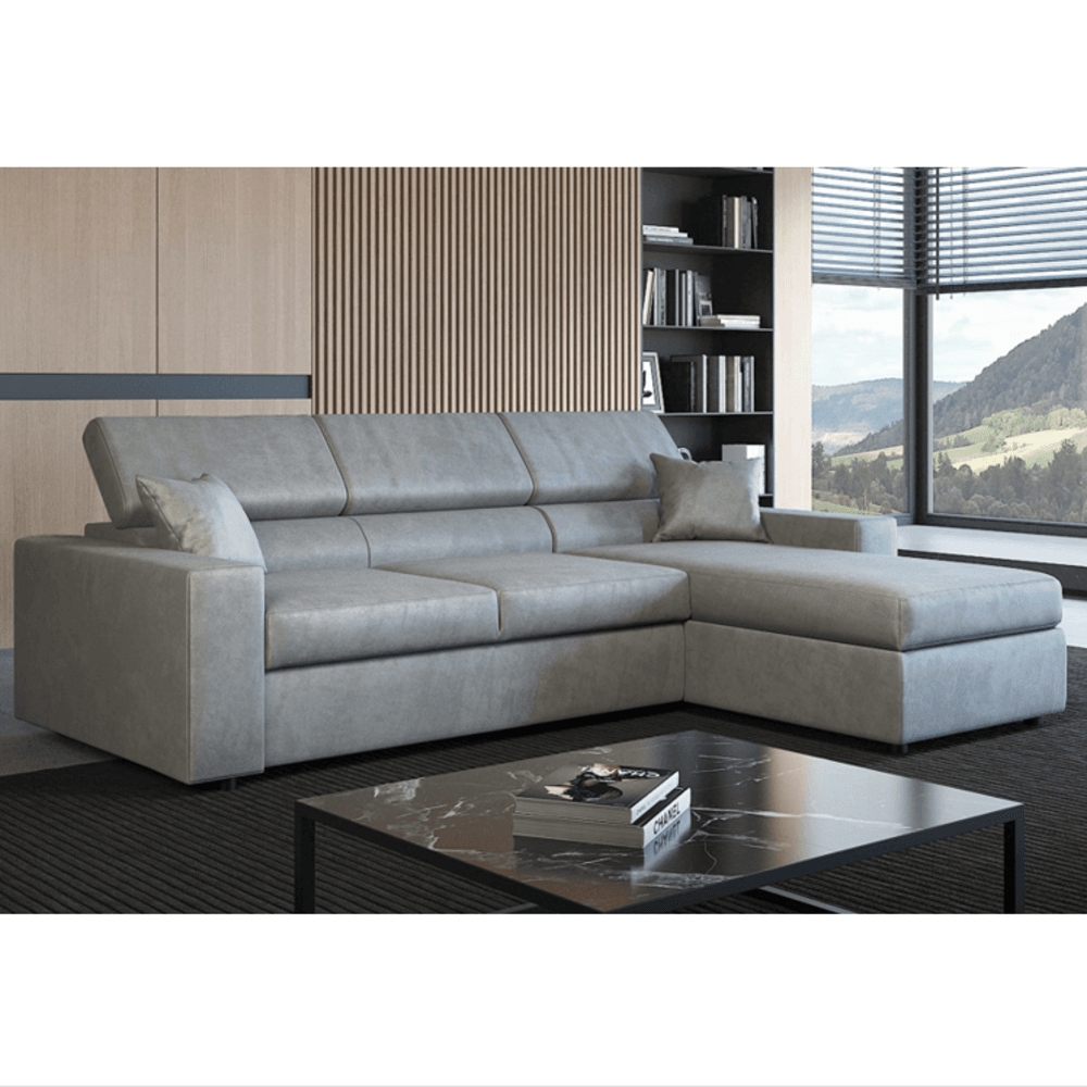 Narożnik MIRA to połączenie nowoczesnego stylu, funkcjonalności i maksymalnego komfortu. Idealny wybór do salonu, który zapewnia przestrzeń do relaksu i wygodne miejsce do spania dla gości. Zaprojektowany z dbałością o każdy detal, narożnik MIRA spełni oczekiwania najbardziej wymagających domowników! Rozkładany narożnik MIRA oferuje wszystko, czego potrzebujesz, aby zapewnić sobie pełen komfort. Dzięki funkcji spania w kilka sekund zamienisz sofę w wygodne łóżko, idealne na nocleg dla gości. Dodatkowo regulowane zagłówki pozwalają dostosować oparcie do indywidualnych potrzeb – niezależnie od tego, czy odpoczywasz z książką, oglądasz film, czy po prostu relaksujesz się po dniu pełnym wyzwań.
