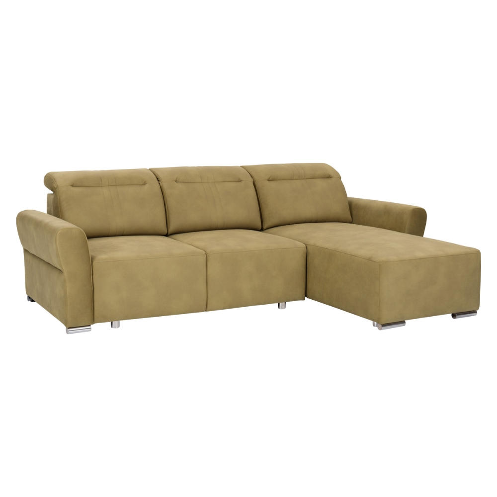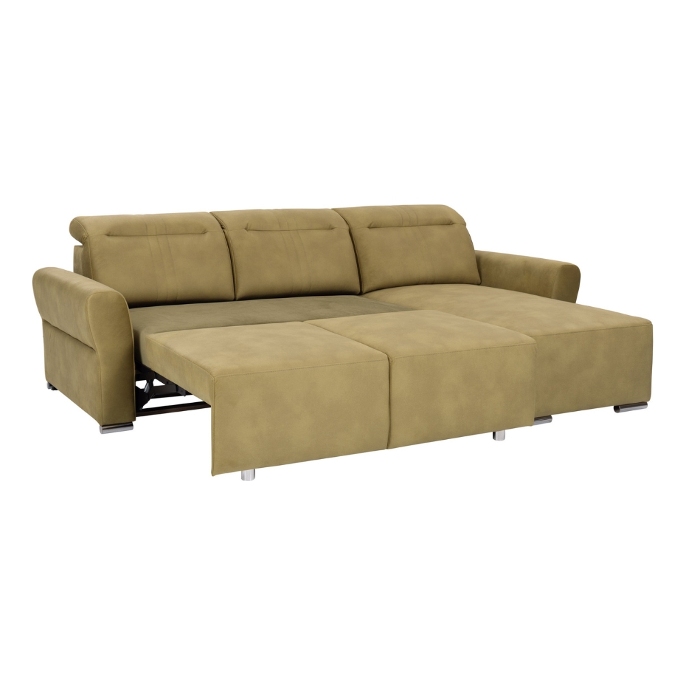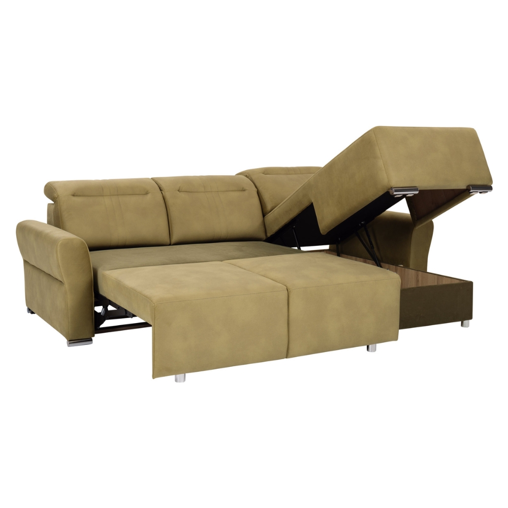 Narożnik w kształcie L to nowoczesny, rozkładany mebel z pianką HR, sprężynami falistymi, regulowanymi zagłówkami, funkcją spania Puma oraz pojemnikiem na pościel.