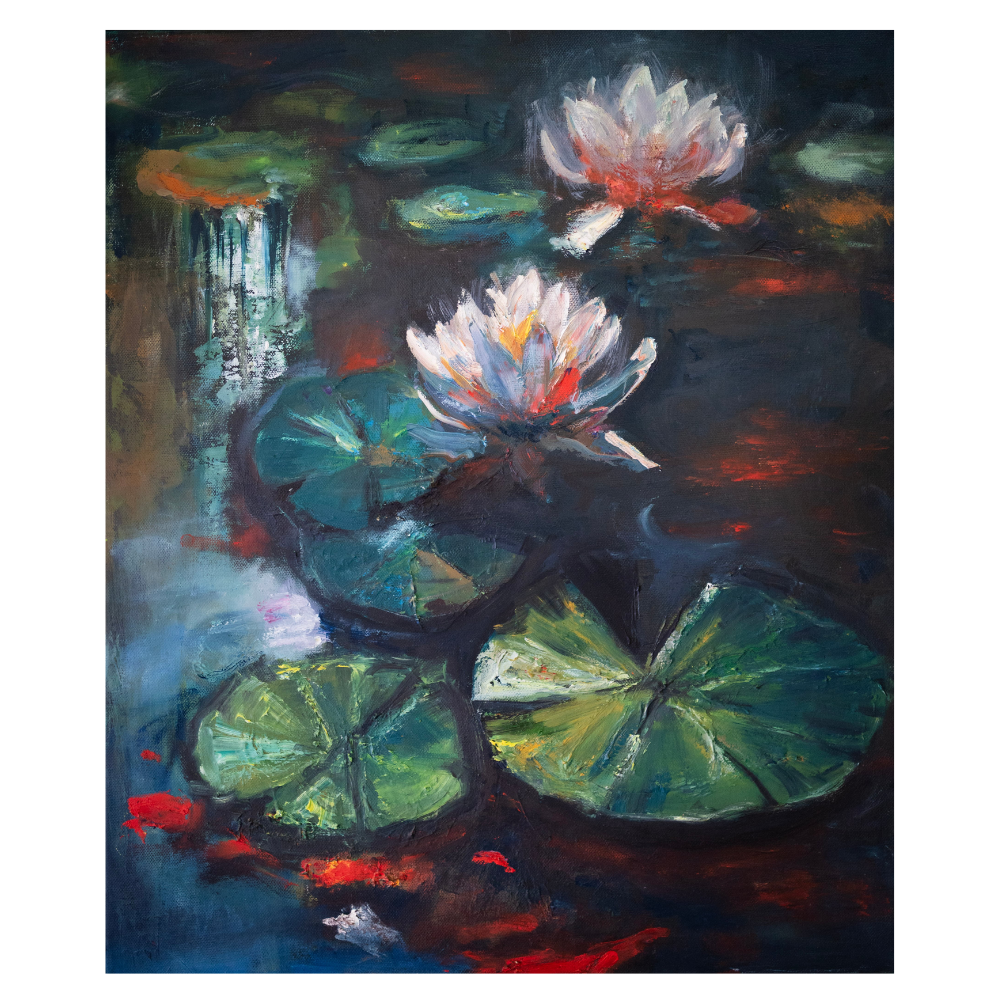 Artystka sięgnęła po głębokie odcienie granatu, zieleni i czerni.  Podkreśliła dzięki temu tajemniczość wodnej toni. Kontrastem dla ciemnych barw stały się świetliste akcenty – intensywna biel i subtelny róż kwiatów lilii. To właśnie ta gra kolorów sprawia, że obraz nabiera dynamiki, głębi i wielowymiarowości, przyciągając spojrzenie niczym żywa opowieść zaklęta w płótnie. Dodatkowo, dzięki technice olejnej każdy fragment obrazu pulsuje światłem i fakturą – pociągnięcia pędzla widać wyraźnie, co potęguje wrażenie autentyczności i ręcznego mistrzostwa.