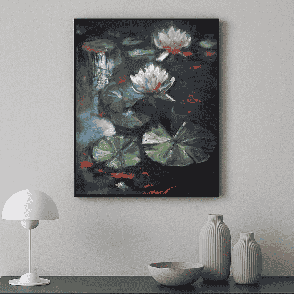 „Rozkwit w mroku” to obraz malowany ręcznie na płótnie farbami olejnymi. Przenosi on nas w świat pełen kontrastów – między ciszą wodnej toni a energią lilii wodnych. To dzieło, w którym natura spotyka się z emocją, a każdy detal został oddany z niezwykłą precyzją i wrażliwością.