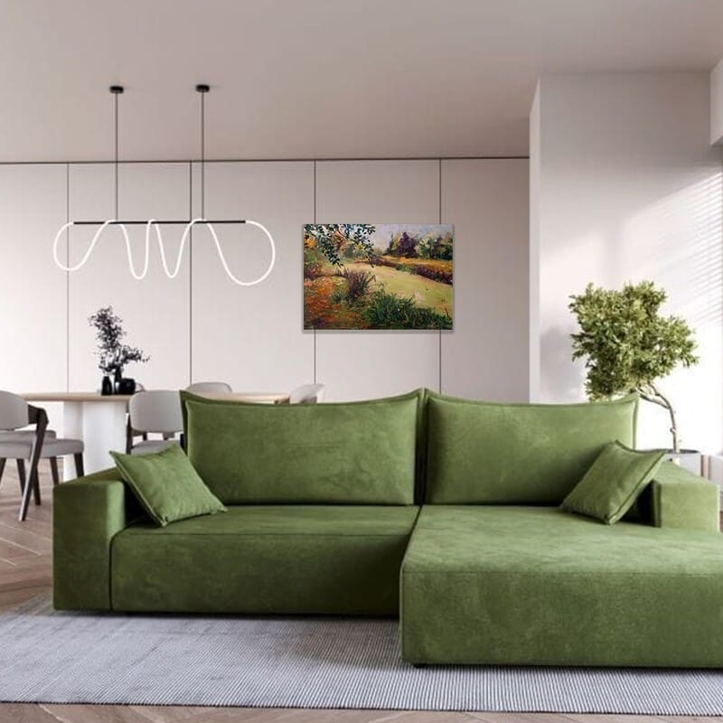 Ręcznie malowany obraz olejny cechuje się delikatnymi przejściami barw i realistycznym oddaniem faktur. Obraz został wykonany na płótnie naciągniętym na sosnowy blejtram, co gwarantuje trwałość i stabilność obrazu. Warstwowe nałożenie kolorów oddaje naturalne oświetlenie oraz bogactwo odcieni zieleni, beżu i brązów. Ten spokojny pejzaż świetnie wpisuje się we wnętrza inspirowane naturą, minimalistyczne oraz klasyczne. Jego nastrojowa kompozycja sprawdzi się w salonie, sypialni, czy przestrzeni przeznaczonej do relaksu. Wymiary 50 cm x 70 cm są doskonałe, by obraz był wyrazistym elementem dekoracyjnym, wprowadzającym harmonię i delikatność do przestrzeni.