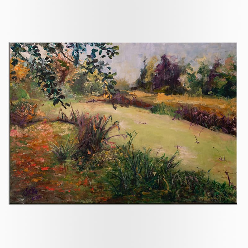 Obraz „Szepty natury” to subtelne przedstawienie spokojnego zakątka przyrody, gdzie dominuje cisza, spokój i harmonia. Artysta uchwycił delikatną zieleń traw, miękki poblask słonecznego światła oraz półcienie, które dodają głębi kompozycji. Ręcznie malowany, techniką olejną, obraz ten przyciąga wzrok swoim ciepłem i nostalgicznym urokiem, przypominając widoki znane z letnich spacerów nad brzegiem zarośniętego stawu. Obraz przypomina nam, że w naturze można znaleźć ukojenie i równowagę, a także przestrzeń do refleksji. Przez bogactwo odcieni zieleni, fioletów i brązów, artysta zachęca odbiorcę do zatrzymania się i poczucia bliskości z otaczającą przyrodą.
